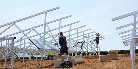 架台の設置が終わったら太陽光パネルの設置を行っていきます。設計図に基づいて正確に配置、滑り落ちてキズや損傷が発生しないように架台にしっかり固定します。